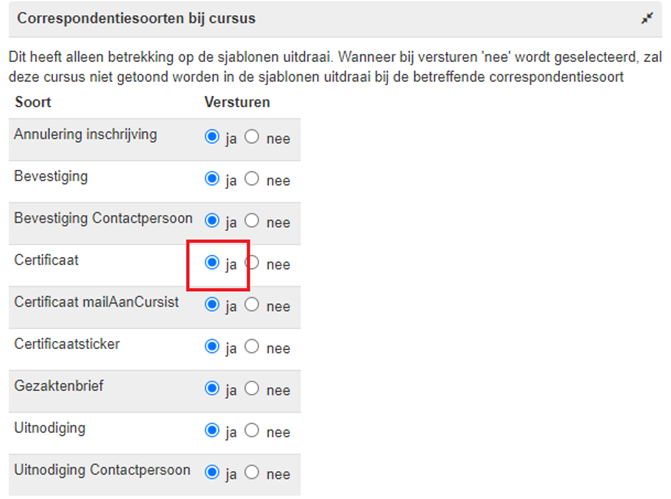 1.  Per correspondentiesoort van een cursus kan aangegeven worden of deze verstuurd mag worden. Controleer of dit op “Ja” staat voor de betreffende correspondentiesoort.